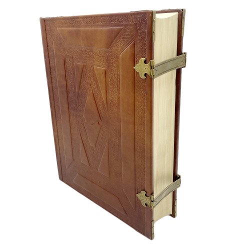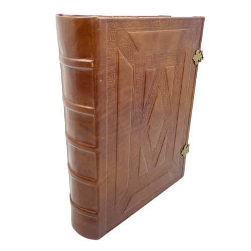 The Printers were Esteban Molina and Javier Guillen. Also here the two volumes were bound by the master Fernando Cerveró. In each volume, the manual touch-ups were carried out, with a brush, necessary to give them the final finish, the fittings were cast by the craftsman José Ballester. The leather that covers the wooden boards was hand-dyed by technician Franco Gozzini.