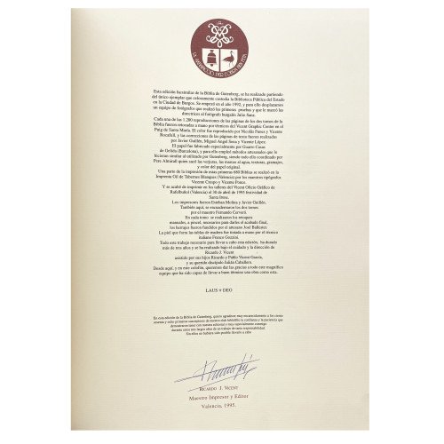 Other information: This facsimile edition of the Gutenberg Bible has been made from the only copy jealously guarded by the Biblioteca Pública del Estado in the city of Burgos. It began in 1992, and for this we sent a team of photographers who carried out the first tests and who set the guidelines for the Burgos photographer Julio Sanz.