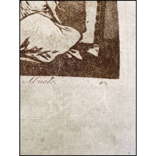 Técnica:Aguatinta. Biselada. Blanco y negro con tonalidades sepia sobre papel verjurado que busca la similitud a la primera edición. Papel con filigrana (Retrato de Goya con sombrero) Numerada en su ángulo superior derecho con 39. Título en plancha en su parte inferior. Esta edición está muy bien impresa y es la mejor después de la cuarta, las planchas se arreglaron y limpiaron y se mejoró mucho la impresion.