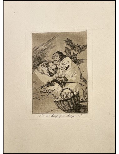Technique: Etching, burnished aquatint and drypoint. Beveled. Black and white with sepia tones on laid paper that looks similar to the first edition. Watermarked paper (Portrait of Goya with hat) Numbered in the upper right corner with 20. Title in plate in the lower part. This edition is very well printed and is the best after the fourth edition, the plates have been cleaned and cleaned and the printing has been improved.
