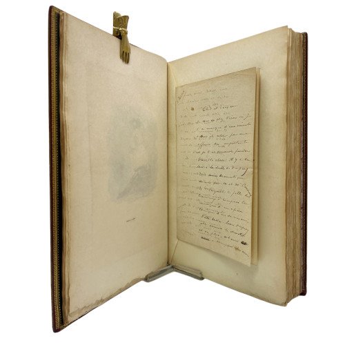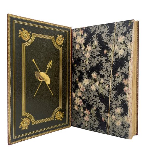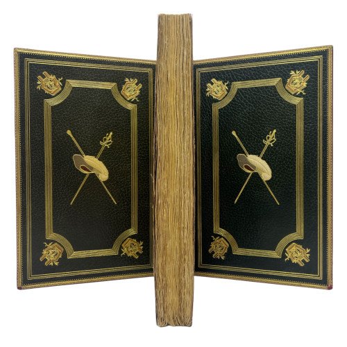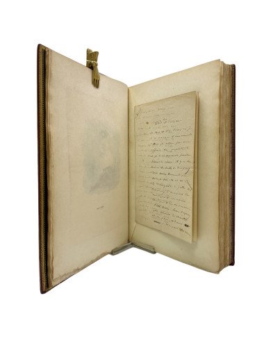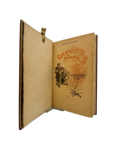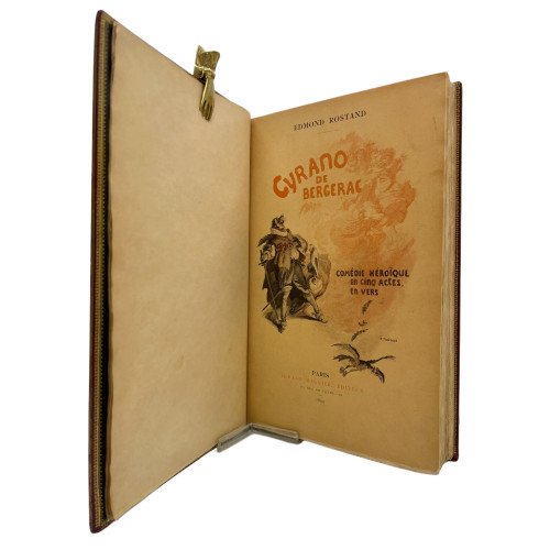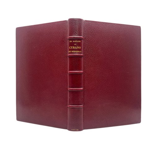 Binding: Beautiful full leather binding in burgundy chagren, nerves and gilt on the spine. The inside covers are a visual spectacle. Made of dark green leather and richly decorated with intricate gilt motifs framing a central oval. Inside, a pair of crossed swords and a feather inlaid with red, green and white leather stand out, iconic elements that evoke the essence of Cyrano: the swordsman and the poet. These details are not only a tribute to the work, but also reflect the dedication and care of the artistic binding. Binding signed but illegible.