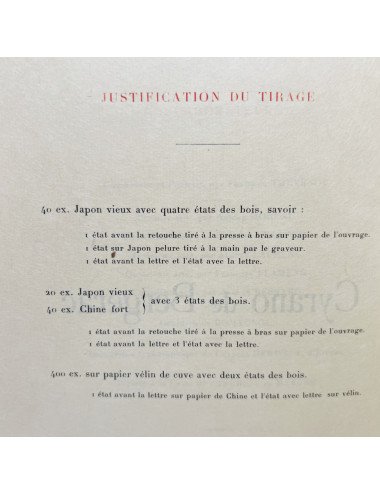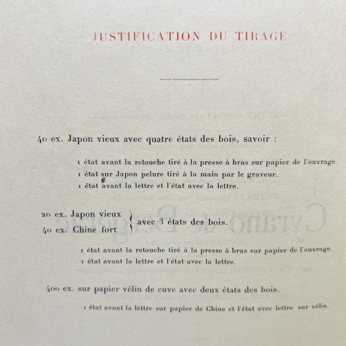 Physical description: Folio (30 cm.) 299 pages, Limited edition of 400 numbered copies on vellum paper with two woodcuts: one before the text on China paper and one between the text on vellum paper.