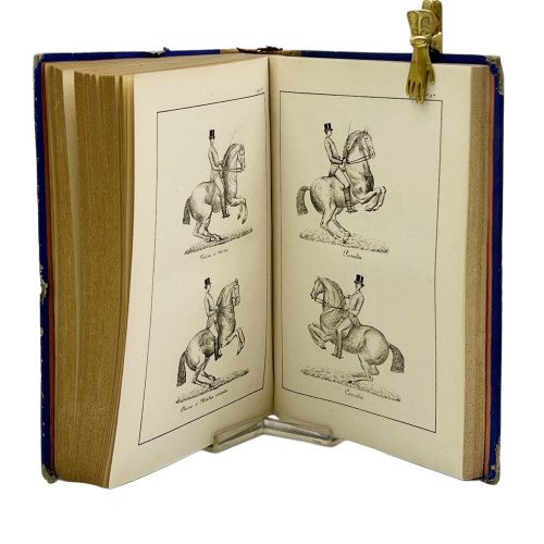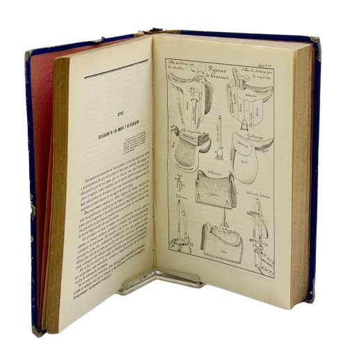 Descripción: Obra magna sobre la equitación y el arte ecuestre en España durante el siglo XIX. Manual completo que abarca desde la selección y cuidado del caballo hasta las técnicas de doma, monta y adiestramiento. Considerado el tratado español más completo de su época sobre la materia. Los dos volúmenes forman una enciclopedia ecuestre con numerosas láminas ilustrativas que detallan sillas, arneses, posturas y ejercicios. Publicada por José Hidalgo y Terrón, reconocido experto en hípica y maestro de equitación. Las láminas incluyen desplegados técnicos de anatomía equina, tipos de monturas y correajes utilizados en la Real Escuela de la época.