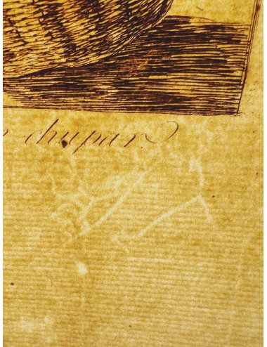 Technique: Etching and burnished aquatint. Bevelled. Black and white with sepia tones on laid paper that seeks to match the first edition. José Guarro paper, watermarked with the Portrait of Goya wearing a hat. Numbered 45 in the upper right corner. Title engraved on the plate along the lower edge.